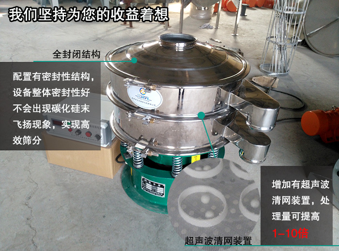 碳化硅專用超聲波振動篩,增加有超聲波清網裝置,處理量可提高1-10倍,是各種高品質、精細粉體物料的理想篩分機型。且配置有密封性結構,設備整體密封性好不會出現碳化硅末飛揚現象,實現高效篩分,一直是我們追求的
