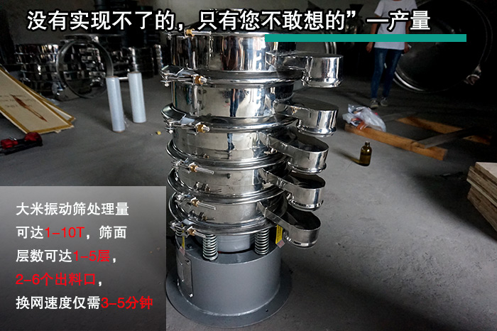 大米振動(dòng)篩處理量可達(dá)1-10T,篩面層數(shù)可達(dá)1-5層,由于大米每次產(chǎn)出量較大,特意設(shè)計(jì)2-6個(gè)出料口,換網(wǎng)速度僅需3-5分鐘,提高效率,不影響大米正常產(chǎn)出量