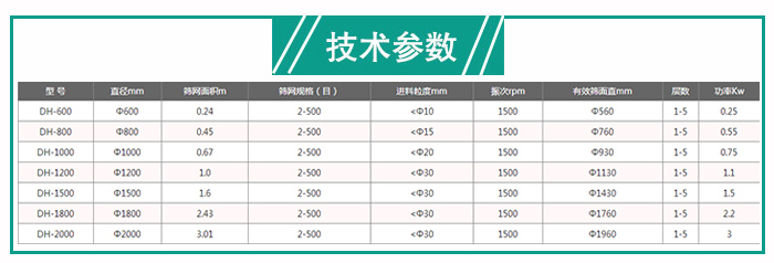 大漢食品調料粉振動篩型號齊全,小到DH—400,單位小時產出100kg,大到DH—1800,單位為小時可以產出3300kg左右,具體的食品調料粉振動篩型號,可以參考上圖食品調料粉振動篩參數表。