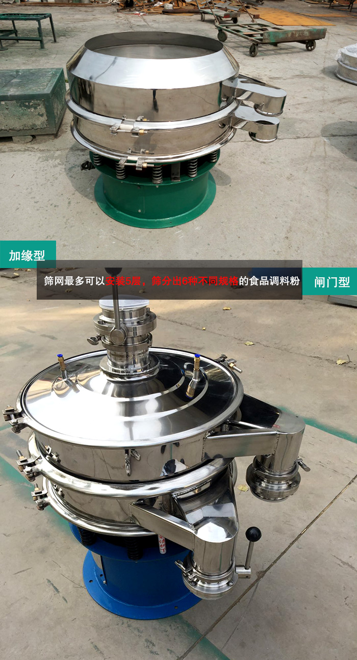 大漢機械的所有產品都可以進行定制設計,食品調料粉振動篩也不例外,可以采用加緣型設計,閘門型設計等多種風格;并且篩網也可以根據用戶的需求進行設計,篩網多可以安裝5層,篩分出6種不同規格的食品調料粉,只有你想不到的,沒有大漢機械做不到的