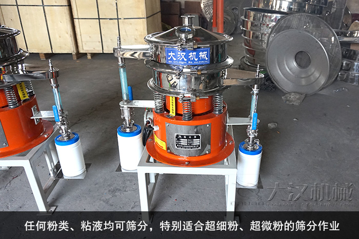氣體保護振動篩是利用超聲波清網的原理,在原有圓形旋振篩的基礎上加裝氣體保護裝置,采用立式振動電機作為激振源,電機上、下兩端安裝有偏心重錘,將電機的旋轉運動轉變為水平、垂直、傾斜的三次元運動,再把這個運動傳遞給篩面,使超微細粉體接受巨大的超聲加速度,從而防止粘附、摩擦、平降、楔入等堵網因素,提高篩分效率和清網效率。