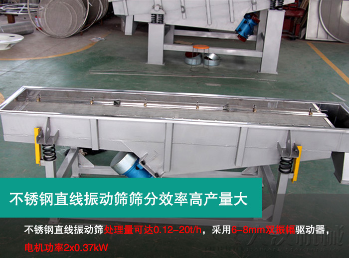不銹鋼直線振動(dòng)篩處理量可達(dá)0.12-20t/h,采用6-8mm雙振幅驅(qū)動(dòng)器,電機(jī)功率2x0.37kW,機(jī)型型號(hào)不一,不同型號(hào)處理量不同,所產(chǎn)出的產(chǎn)出量也是不同的