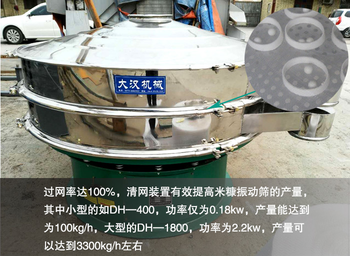 米糠振動篩篩網(wǎng)清理裝置把堵網(wǎng)率降到低過網(wǎng)率達100%,清網(wǎng)裝置有效提高米糠振動篩的產(chǎn)量,其中小型的如DH—400,功率僅為0.18kw,產(chǎn)量能達到為100kg/h,大型的DH—1800,功率為2.2kw,產(chǎn)量可以達到3300kg/h左右,篩分產(chǎn)量比較大
