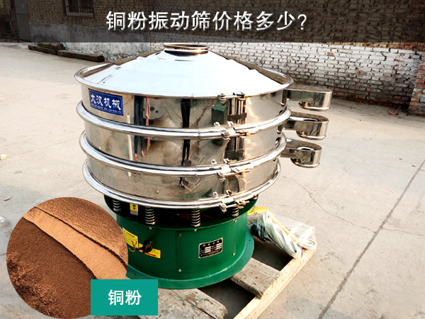 銅粉是供制造化學用具、電力用具、建筑材料和其他工業裝置及用具的一種粉狀物料,由于市場的需求量較大,因此篩分銅粉的振動篩成為了一大商機,根據多年經驗來說,銅粉篩分我們一般使用旋振篩,因此銅粉振動篩就是旋振篩,以大漢機械為例來說,它的價位在6000-18000元之間不等