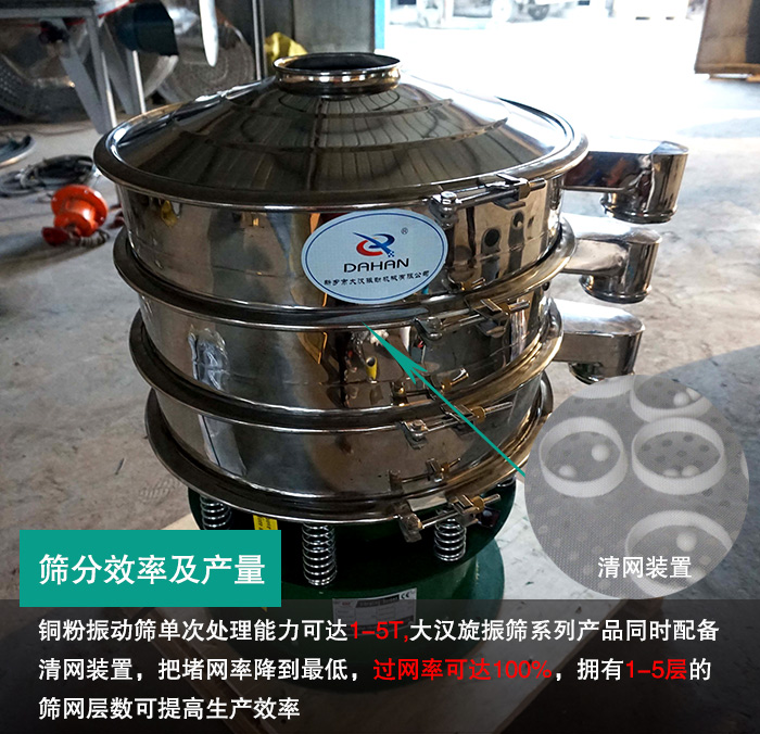 銅粉振動篩單次處理能力可達1-5T,大漢旋振篩系列產品同時配備清網裝置,把堵網率降到低,過網率可達100%,擁有1-5層的篩網層數可提高生產效率,因此產量上也會相應增大,銅粉振動篩篩分效率越高,產量越大,機型配置越高,價格就會比普通型的有所差異,然而就造成了價格的不一