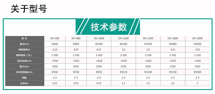 銅粉振動篩型號有身多種從DH600-DH2000型,型號不同,電機功率就會不同,篩分效率也會有所變化,進而產品所帶來的產量也會跟著變化,價格也就不同了,型號詳情請看上圖