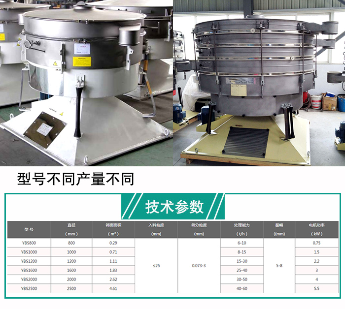 金剛砂振動篩的生產力是判斷其性能的標準之一,而不同廠家使用的型號也不相同,所以在選擇廠家時就需要根據自身生產需求合理選擇廠家。不同型號的振動篩在產量方面差別是比較大的,大漢機械金剛砂振動篩型號齊全,有YBS800,YBS1000,YBS1200,YBS1600,YBS2000,YBS2500,電機功率0.75-5.5kw,不同型號篩分功率不同,產量也是不相同的