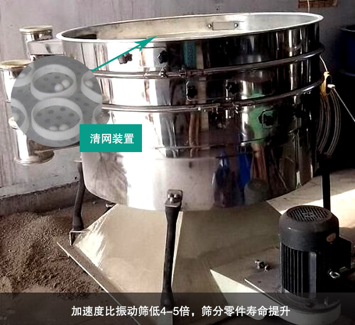 使用硅橡膠球以及清網裝置系統,篩孔不會堵塞,既能帶給用戶高產量,又能保護篩網,不會因為多次堵塞而毀壞,在金剛砂振動篩篩分的過程中加速度比振動篩低4-5倍,篩分零件壽命提升而維護減少