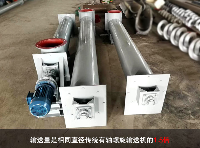 單次進料1.9-199m³/h,處理能力在11.4-455m³/h,輸送量是相同直徑傳統(tǒng)有軸螺旋輸送機的1.5倍