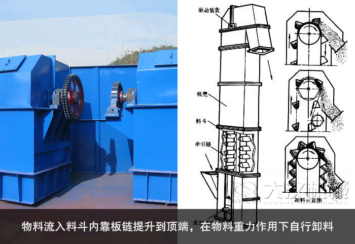 NE系列板鏈斗式提升機采用流入式喂料,物料流入料斗內靠板鏈提升到頂端,在物料重力作用下自行卸料。