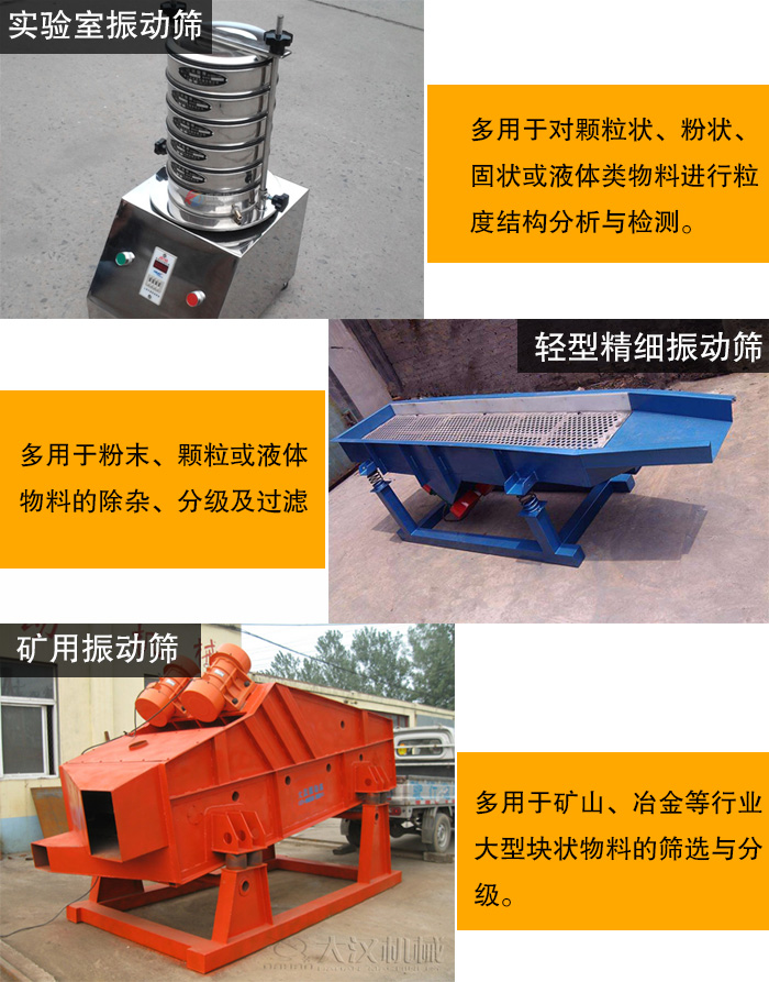 輕型精細振動篩多用于粉末、顆粒或液體物料的除雜、分級及過濾,礦用振動篩多用于礦山、冶金等行業大型塊狀物料的篩選與分級,實驗室振動篩多用于對顆粒狀、粉狀、固狀或液體類物料進行粒度結構分析與檢測。