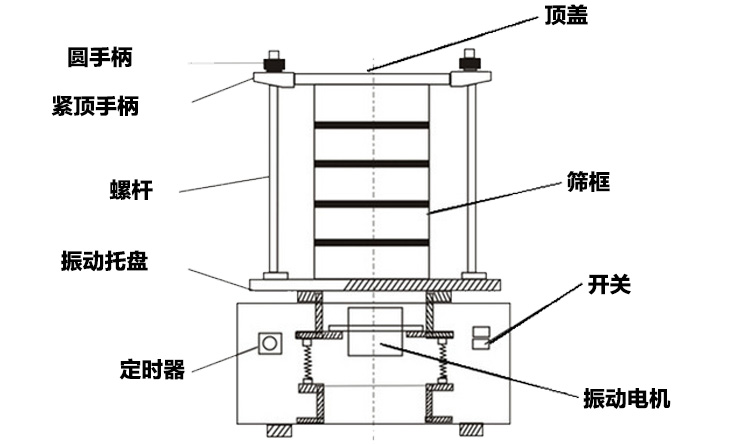 試驗篩機以立式振動電機作為整機振動源,通過振動電機帶動上部振動盤振動,再通過振動盤傳導至安放在振動盤上部的篩框上,然后由需要檢測目數的篩框把小于篩網孔徑的物料顆粒篩分至下層篩框,如此層層篩選,使每層試驗篩內只留相同粒度的物料,達到不同粒度的分離并確定此物料的粒度組成,使篩框中的物料能非常有效的起到過濾、分級、篩分目的。