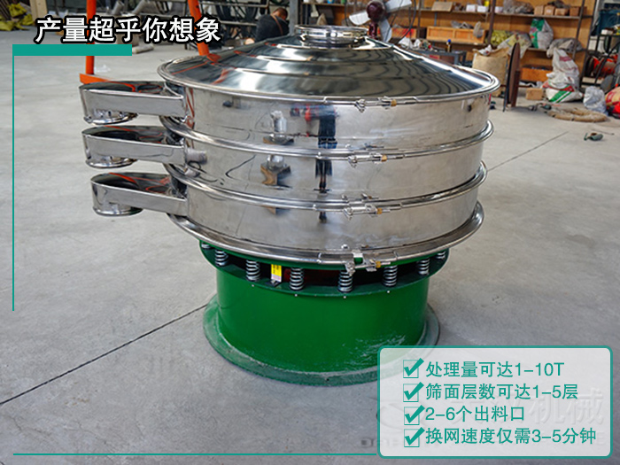 花生米振動篩處理量可達1-10T,篩面層數可達1-5層,由于花生米每次產出量較大,特意設計2-6個出料口,換網速度僅需3-5分鐘,提高效率,不影響花生米正常產出量